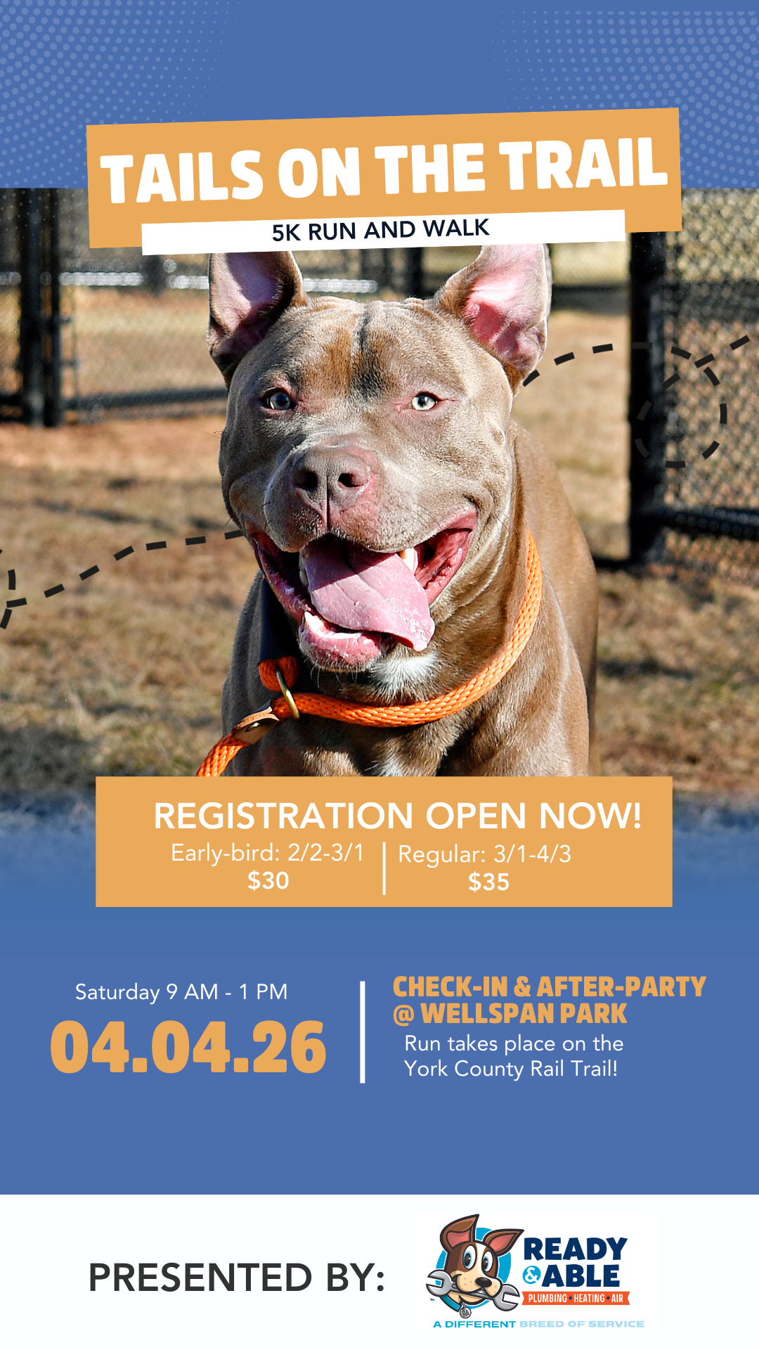 🐾 Tails on the Trail 5K Presented By: Ready & Able 🐾 Saturday, April 4 | WellSpan Park Join the York County SPCA for our inaugural Tails on the Trail 5K, a community-focused run/walk benefiting animals in need. This fun, family-friendly event brings together animal lovers, local businesses, and neighbors for a meaningful morning of movement, compassion, and community impact! Check-in will begin at 8 AM and the post-race after-party will take place at WellSpan Park, while the 5K run/walk itself will take participants onto the scenic York County Rail Trail. Whether you’re running for a personal best, walking with friends, or strolling alongside your leashed pup, all paces are welcome. The race will begin at 9 AM! Every registration will help support the lifesaving work of the York County SPCA and second chances for vulnerable animals in our community. Your participation ensures that dogs, cats, and other animals receive the care they need while they wait for loving homes. Registration Details: 🐾 Early-Bird Registration: February 2 – March 1 | $30 🐾 Regular Registration: March 1 – April 3 | $35 Participants who register early will receive a complimentary event t-shirt, and all registrants are encouraged to fundraise individually or as part of a team to make an even greater impact for animals in need. Register HERE: https://www.ycspca.org/5k Come out, get active, and make a difference—because every step taken on the trail helps change a life! 🐶🐱💙 Our shelter is open for public browsing hours Tuesday, Thursday anf Friday from 12 – 4PM and Saturday from 10:00 AM – 2:00 PM. Our shelter is also available by appointment, Sunday – Saturday, from 8:00 AM – 4:30 PM. Every animal at the YCSPCA deserves a loving, permanent home. From our adventurers to our cuddlers and couch potatoes, someone is waiting for you at the York County SPCA. Find your perfect companion and change a life forever through adoption. Meet our adoptable pets! |
